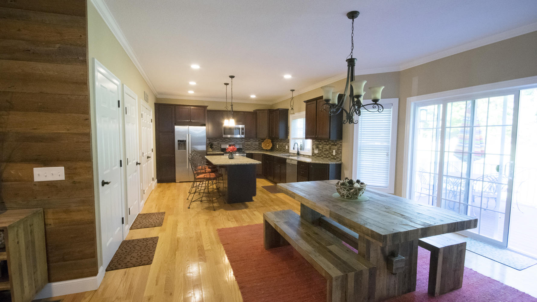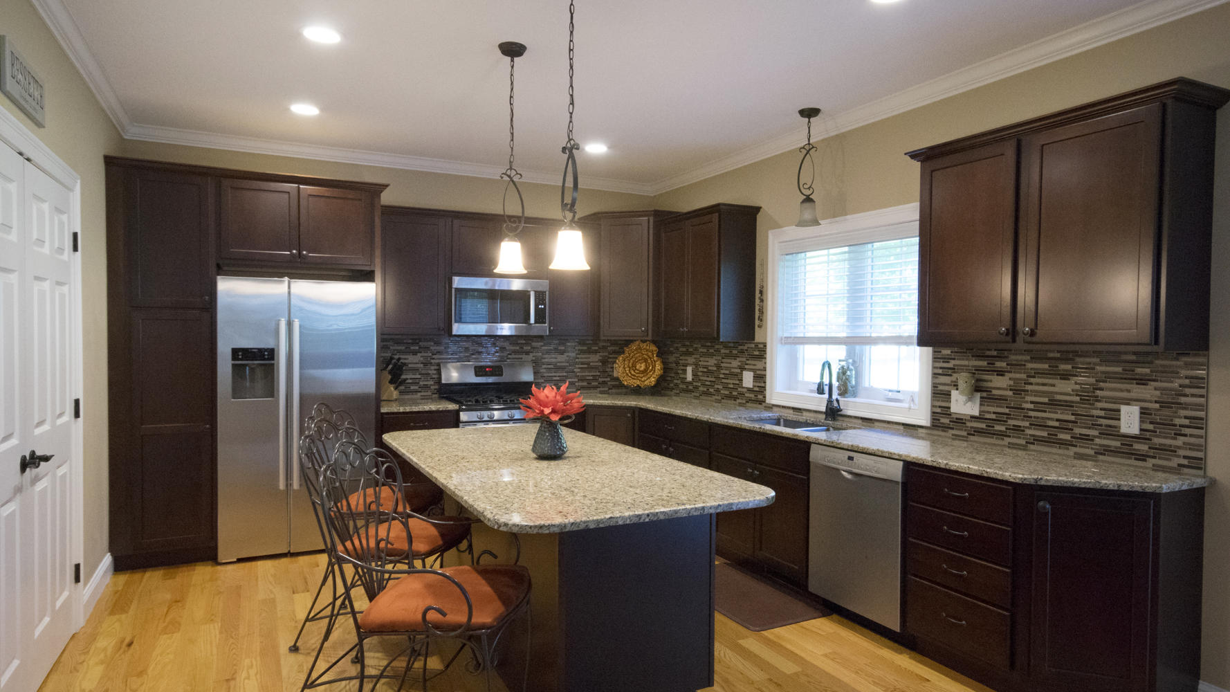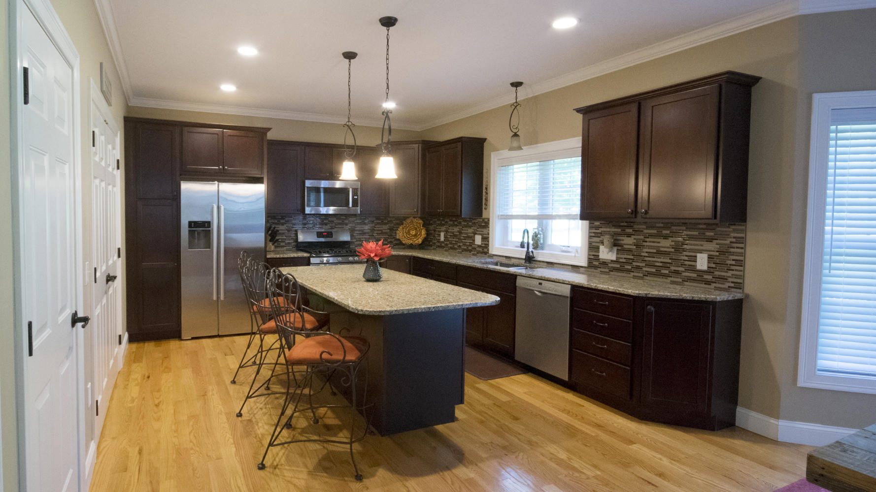 The open-concept kitchen/dining area includes granite counter-tops, custom mosaic back-splash, Energy Star rated Bosch appliances and gleaming hardwood floors throughout.